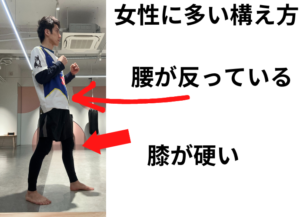 女性に多い構え方が「後ろ重心」と膝が硬い事が多くあげられます!