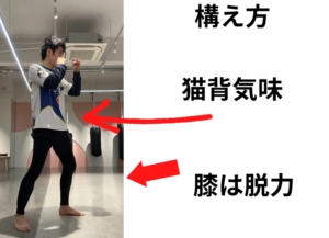 女性が最初に躓くポイントは構えです。その理由は普段の姿勢にあります。キックボクシングの構えは、若干上半身は猫背ぎみ、下半身はガニ股になります。