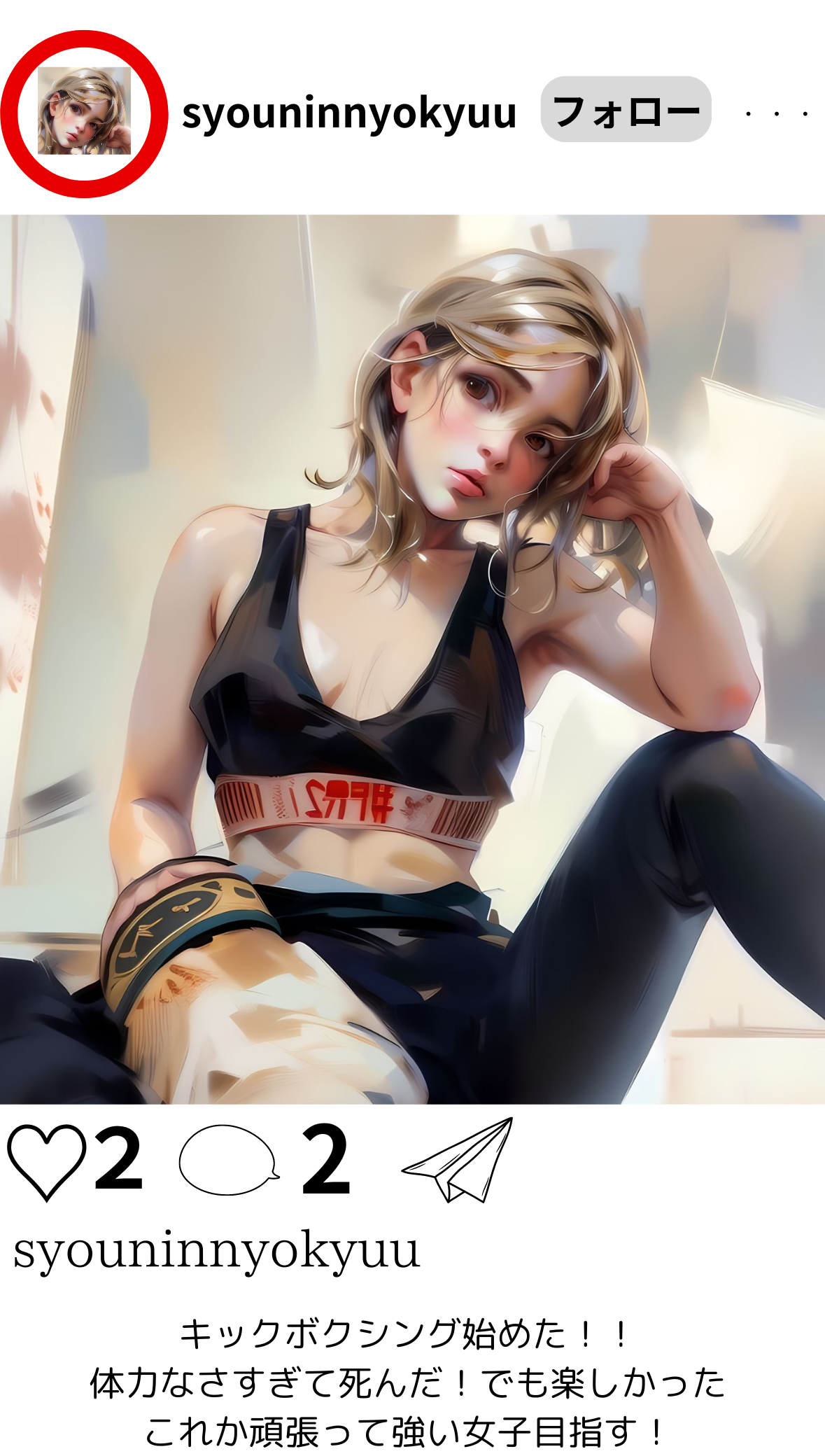 その翌日「キックボクシングでバテバテ〜〜体力無さすぎて笑える!!でもスッキリ!!」みたいな投稿をしてる、大してキックボクシングが好きでもなく次の日には忘れてそうで、
