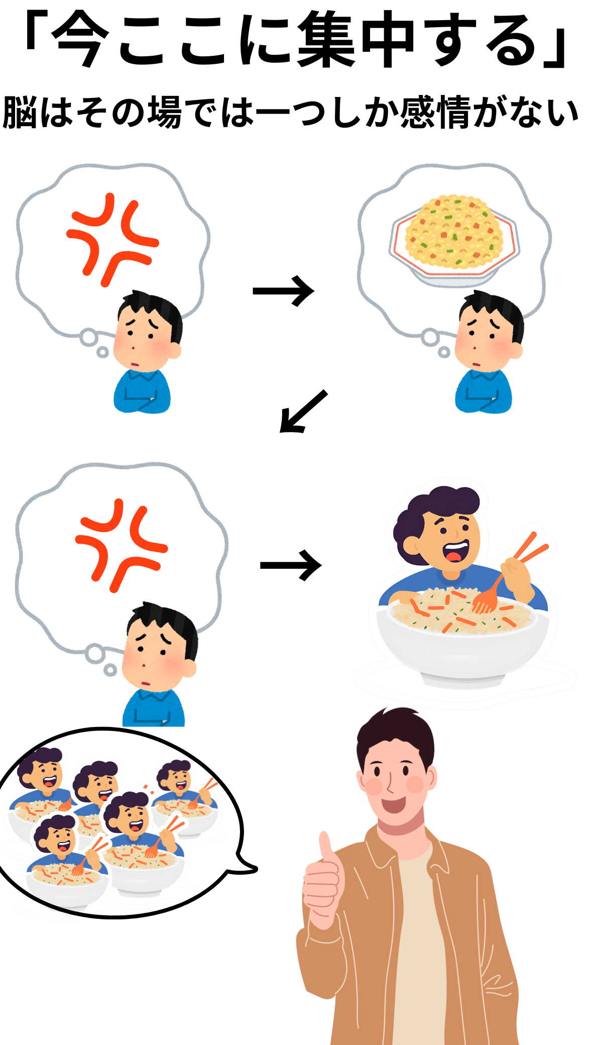これは悩みの状態から「今ここにあるチャーハンに意識がいき、脳がストレス感じなくなった状態です。われながらになんと分かりやすい説明でしょうか!!素晴らしい!