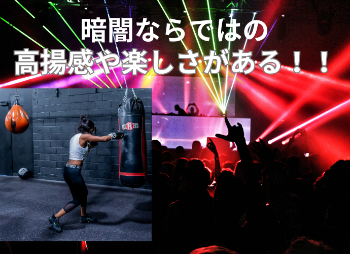 暗闇の中でサンドバックなどが吊るされており、アップテンポの曲に乗せながら、リズミカルにパンチやキックをぶち込んでエクササイズをすると言うスタイルのフィットネス