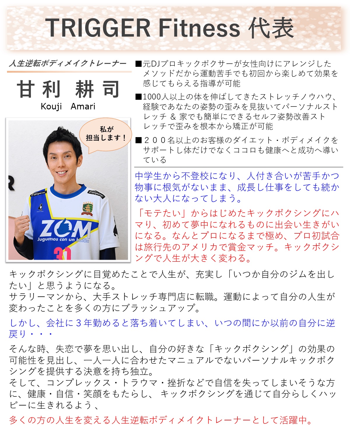 探していた所、トリガーフィットネス さんを見つけました。その時は現に通っていたジムに不満はなかったので、体験だけのつもりで、、、