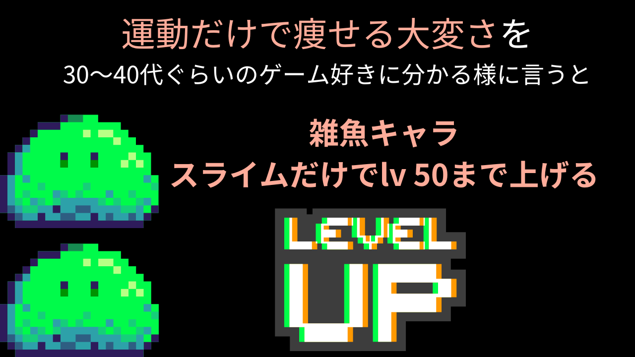 - 30〜40代の男性にしかわからない例えでいうと「スライムだけを倒してレベル溜めでLv 50まで持っていくぐらい」